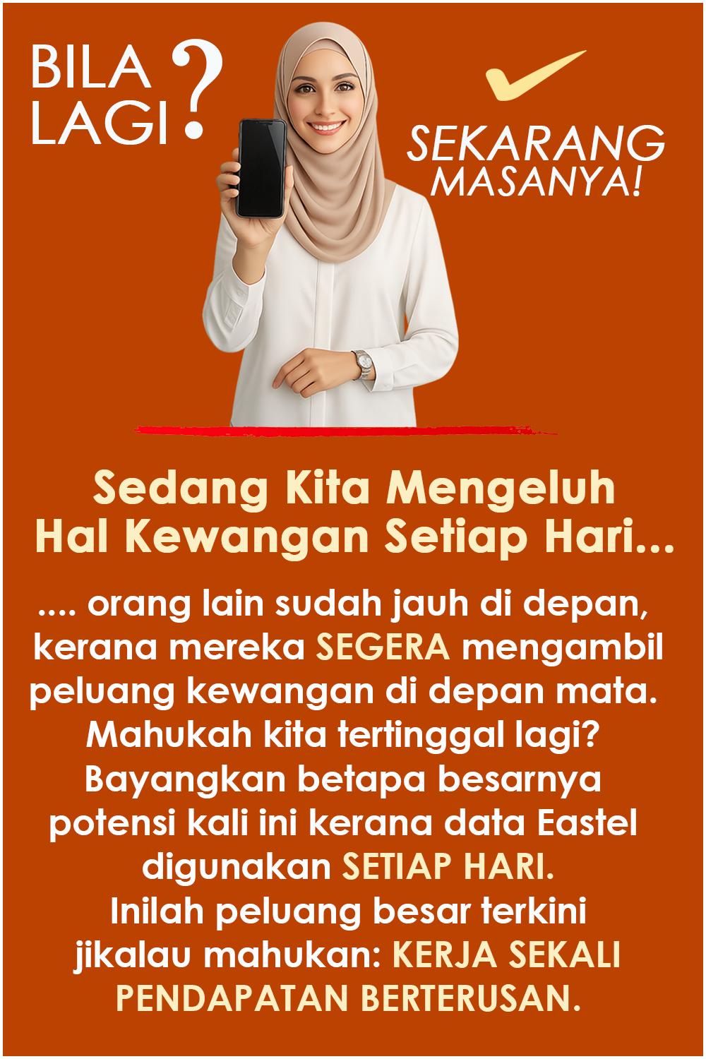 Sekarang, dengan SISTEM AUTOPILOT, anda hanya mengambil sebahagian kecil kerja. Selebihnya dilakukan oleh sistem. Bukan Duduk Diam Dapat Duit, tapi Autopilot. Anda perlu promosi link di media sosial, WhatsApp. Bila mendapat respons, mereka akan menjadi tajaan anda.